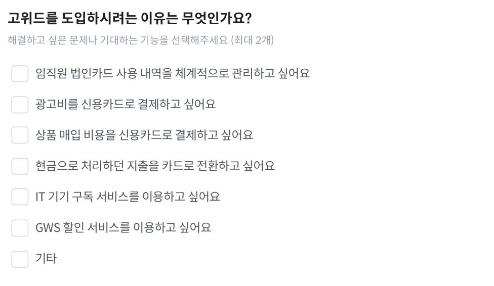 고위드 카드는 최고의 고객경험과 최적의 금융상품을 제공하기 위해, 매월 제한된 고객사만을 모시고 있습니다. 회사에 대한 정보를 정확하게 작성해 주시면 카드 발급 가능 여부를 확인하는데 도움이 됩니다. 신청서 승인 시, 결과 안내 메일로 카드 발급을 시작할 수 있는 링크를 보내 드립니다.