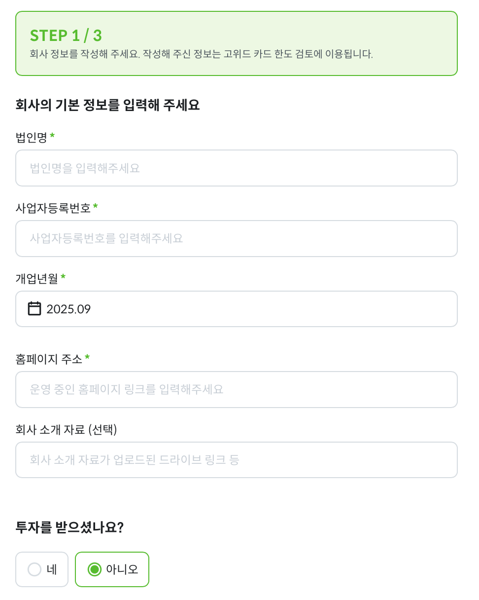 회사 정보를 작성해 주세요. 작성해 주신 정보는 고위드 카드 한도 검토에 이용됩니다.