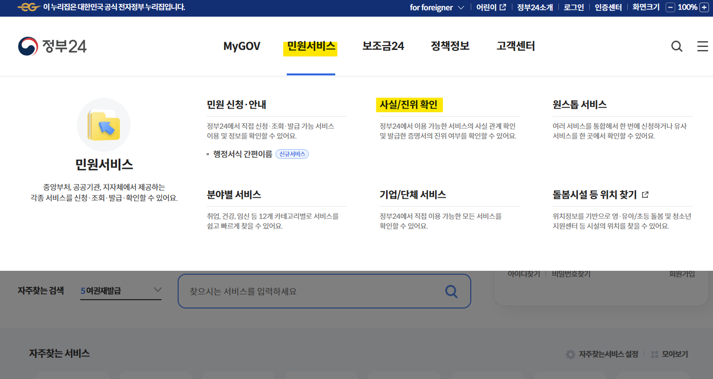 App: 정부24 앱 접속 → 메뉴 → 사실/진위확인 선택 → 주민등록증 진위확인/잠금해제 메뉴 선택