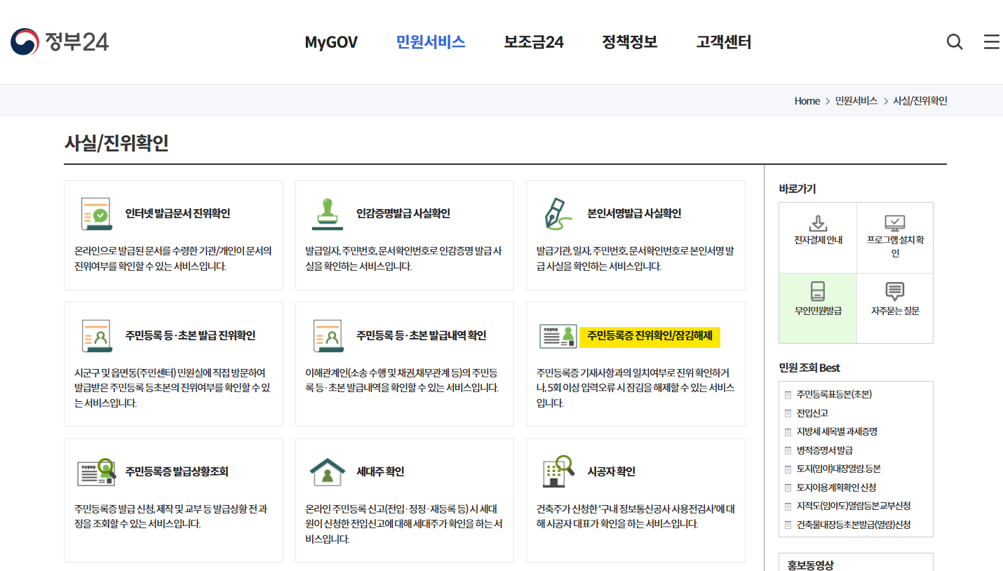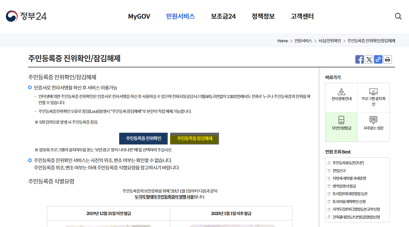 Web: 민원서비스 → 사실/진위확인 → 주민등록증 진위확인/잠김해제 → 주민등록증 잠김해제 클릭