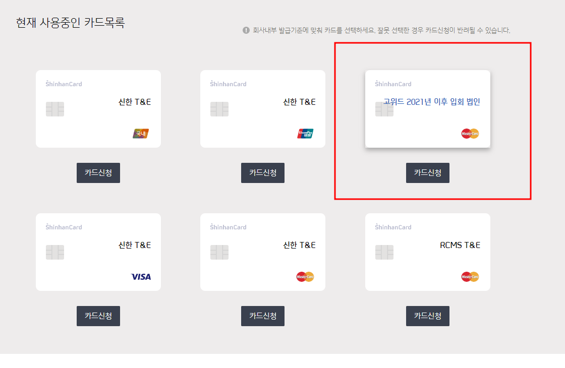 고위드 최초입회 후 카드 최초발급 시에는 기명 법인카드 발급이 불가하십니다.
