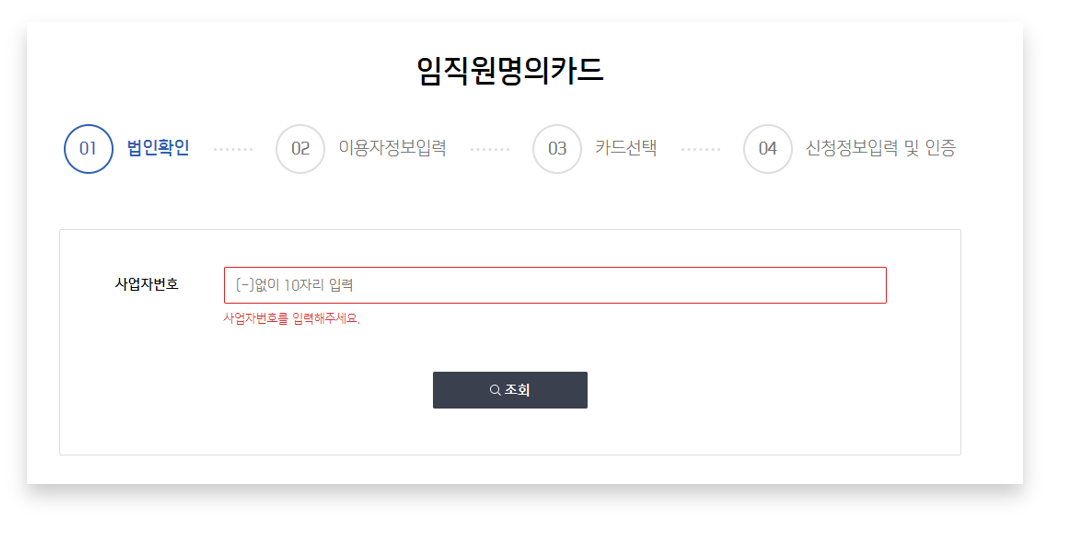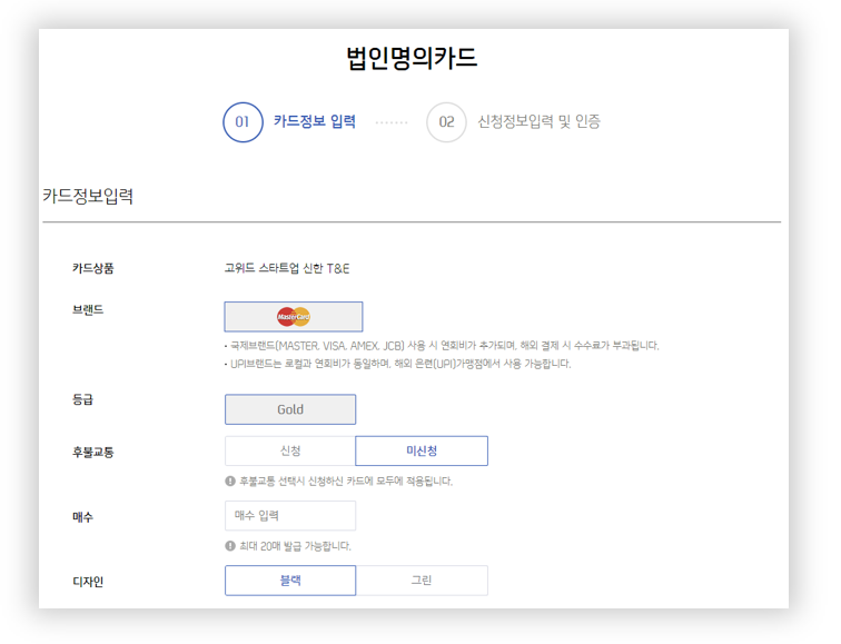 최초발급 시에는 무기명 법인카드만 발급 신청이 가능하며, 발급완료 후 기명카드도 신청 가능하시게 되는 점 참고 부탁드립니다.