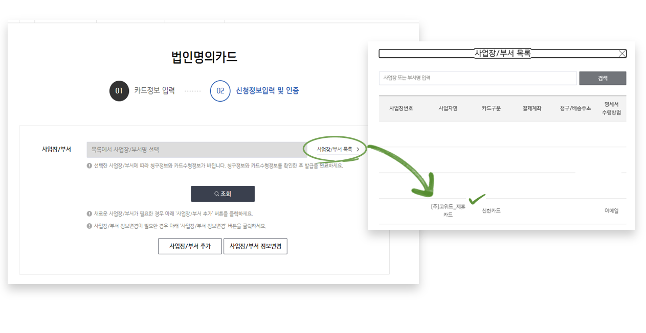 • [사업장 부서 목록] 클릭 → 목록에서 "법인명_제휴" 선택 (ex. (주) 고위드_제휴)