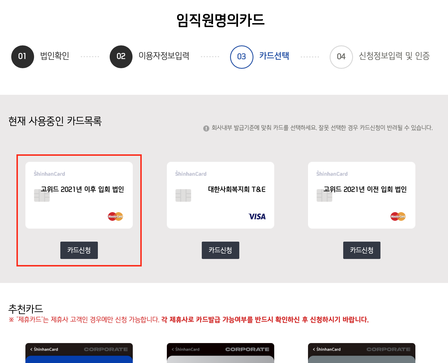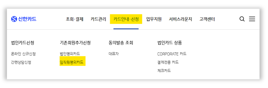 • 카드안내/신청 → 임직원명의카드 선택