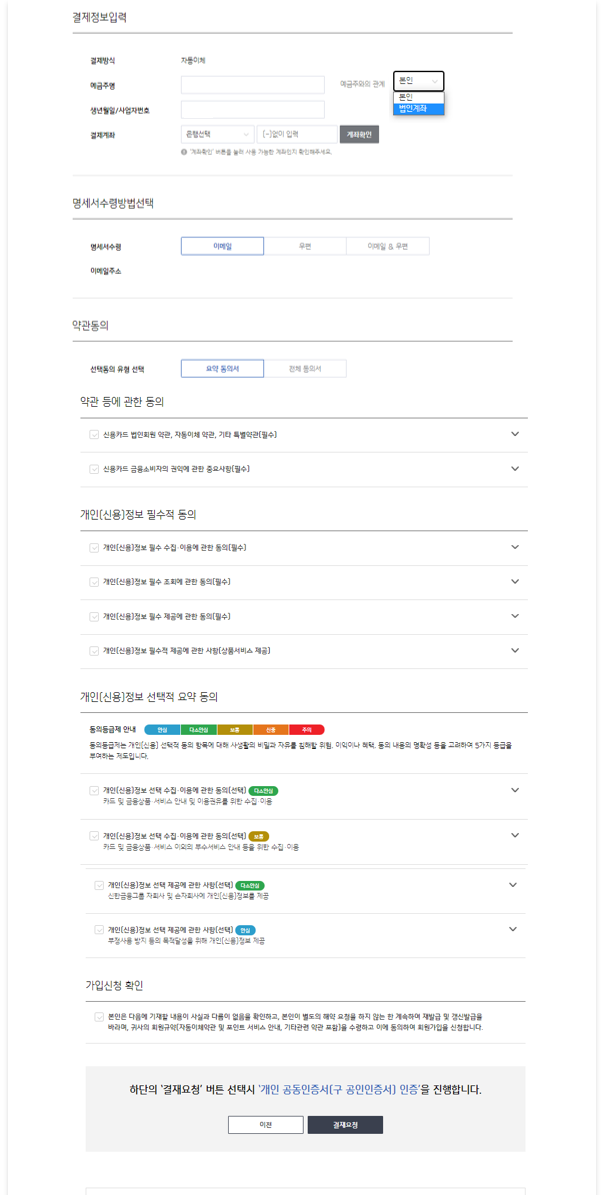• 개인계좌 또는 법인계좌 중 카드 대금 결제 계좌를 선택할 수 있어요.