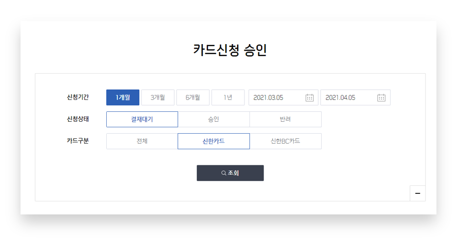 • 상단 [ 카드관리] → [카드신청승인] 클릭