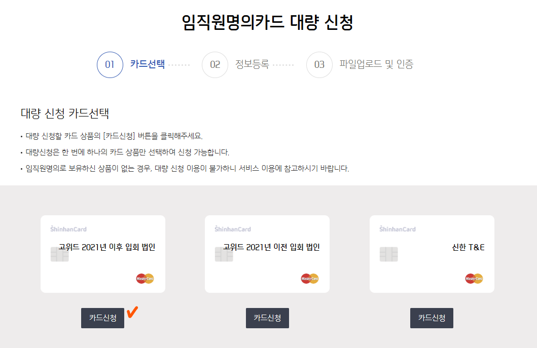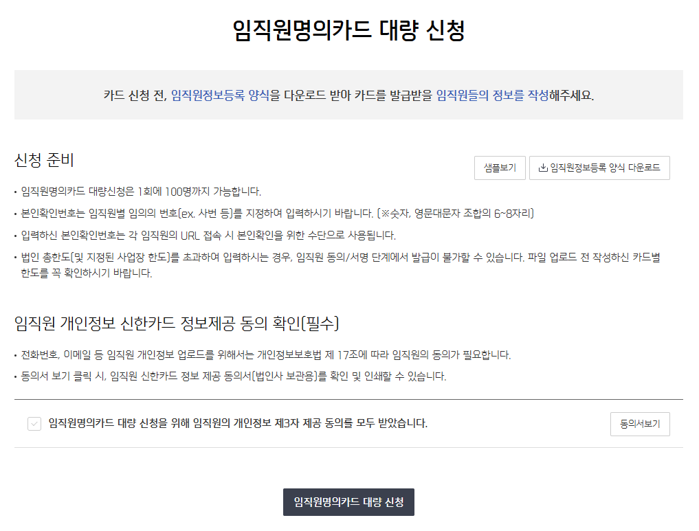 임직원명의카드 대량신청은 1회에 100명까지 가능합니다.