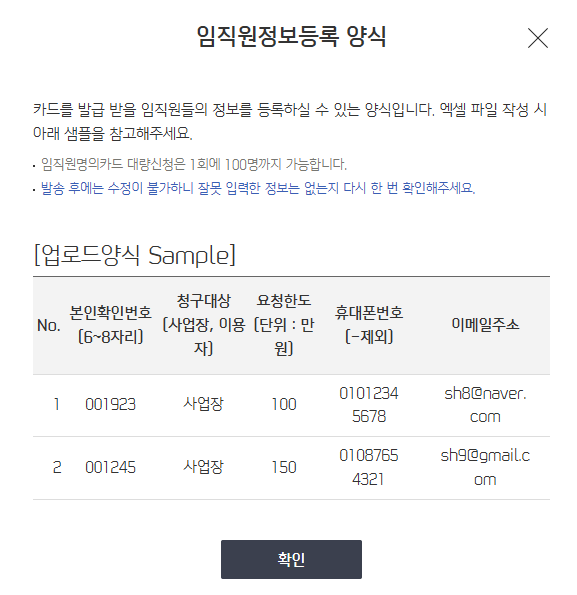 파일 업로드 전 작성하신 카드별 한도를 꼭 확인하시기 바랍니다. 법인 총한도 및 지정된 사업장 한도를 초과하여 입력하시는 경우, 임직원 동의/서명 단계에서 발급이 불가할 수 있습니다.