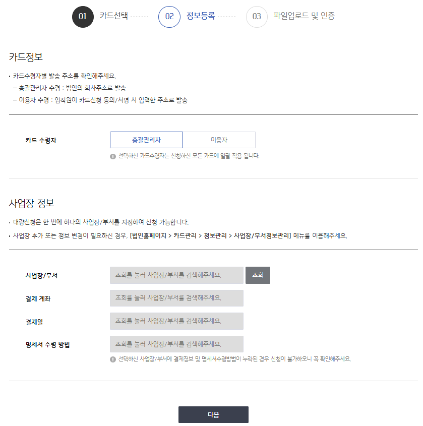 • 카드 수령자를 이용자로 하시는 경우, 카드가 각각 다른 주소지로 배송될 수 있기 때문에 총괄관리자로 지정하시는 것을 권유드려요.