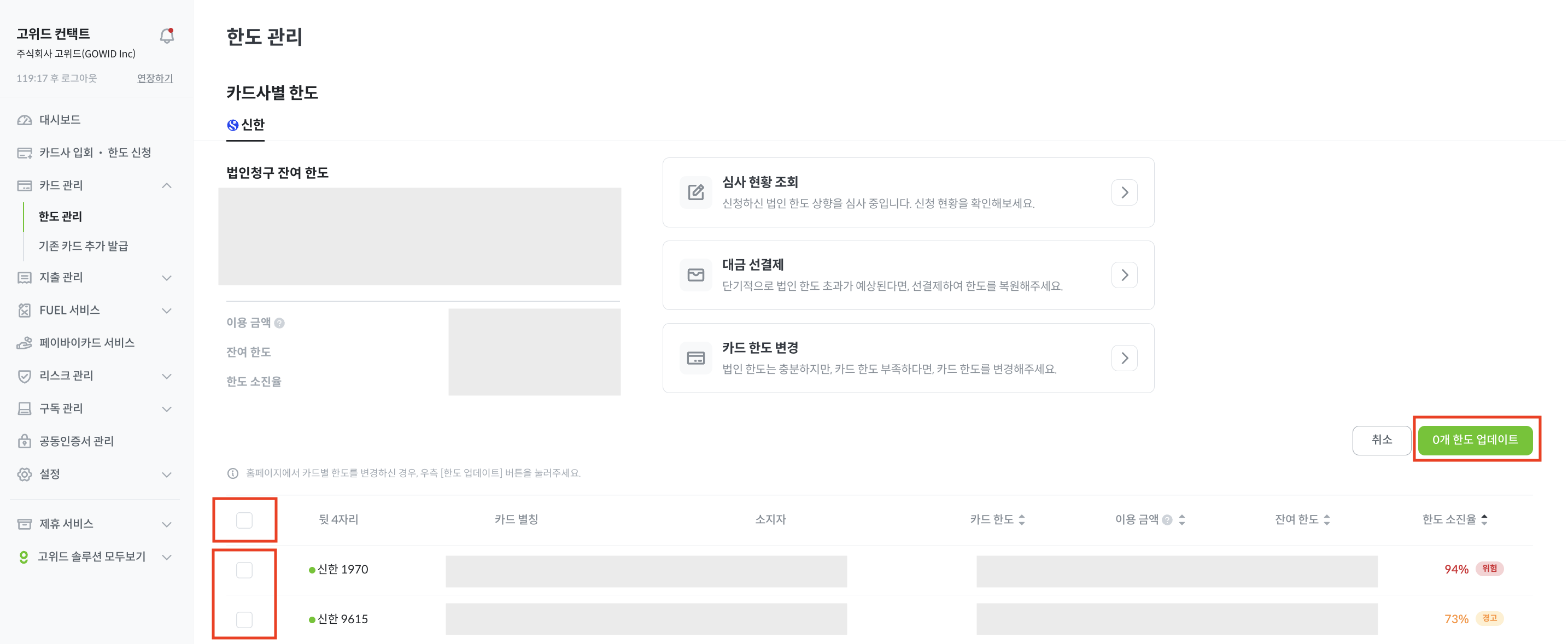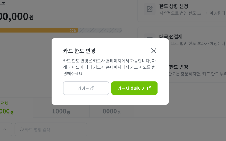 카드 이용한도는 법인사 한도 및 그룹한도(법인 총한도)를 초과할 수 없습니다.