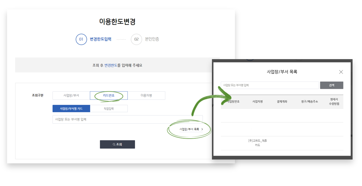 [카드번호]→[사업장/ 부서별 카드]선택 → 사업장/부서 목록 조회를 통하여 사업장 선택 후 조회