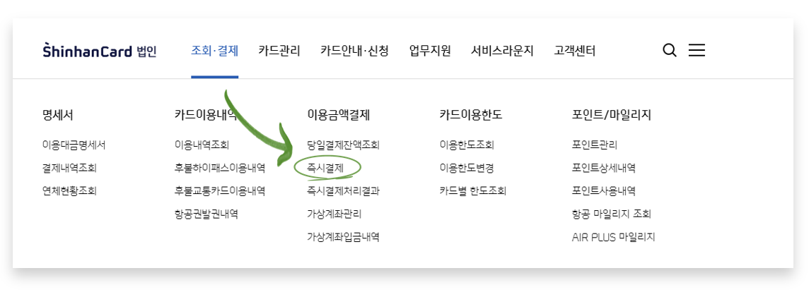 신한 법인카드 홈페이지로 직접 접속하시는 경우, 아래 이미지를 참고해주세요.