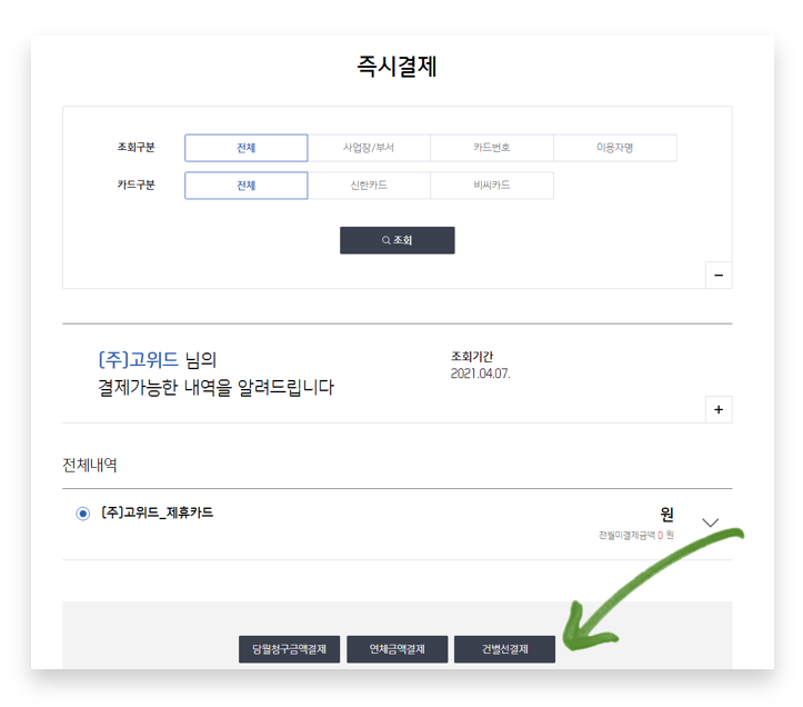 [카드사 홈페이지]를 클릭하시면 [즉시결제] 페이지로 접속됩니다.