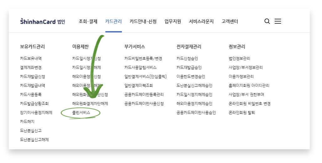 상단 메뉴 [카드관리] > [클린서비스] 클릭