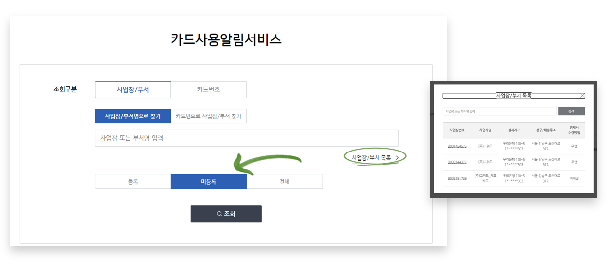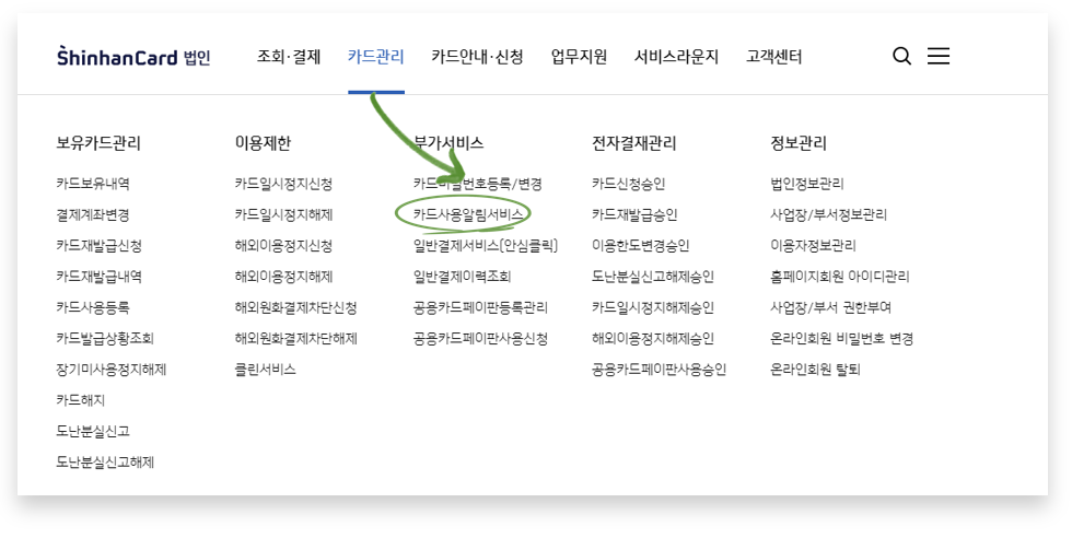 상단 메뉴 [카드관리] → [카드사용알림서비스] 클릭
