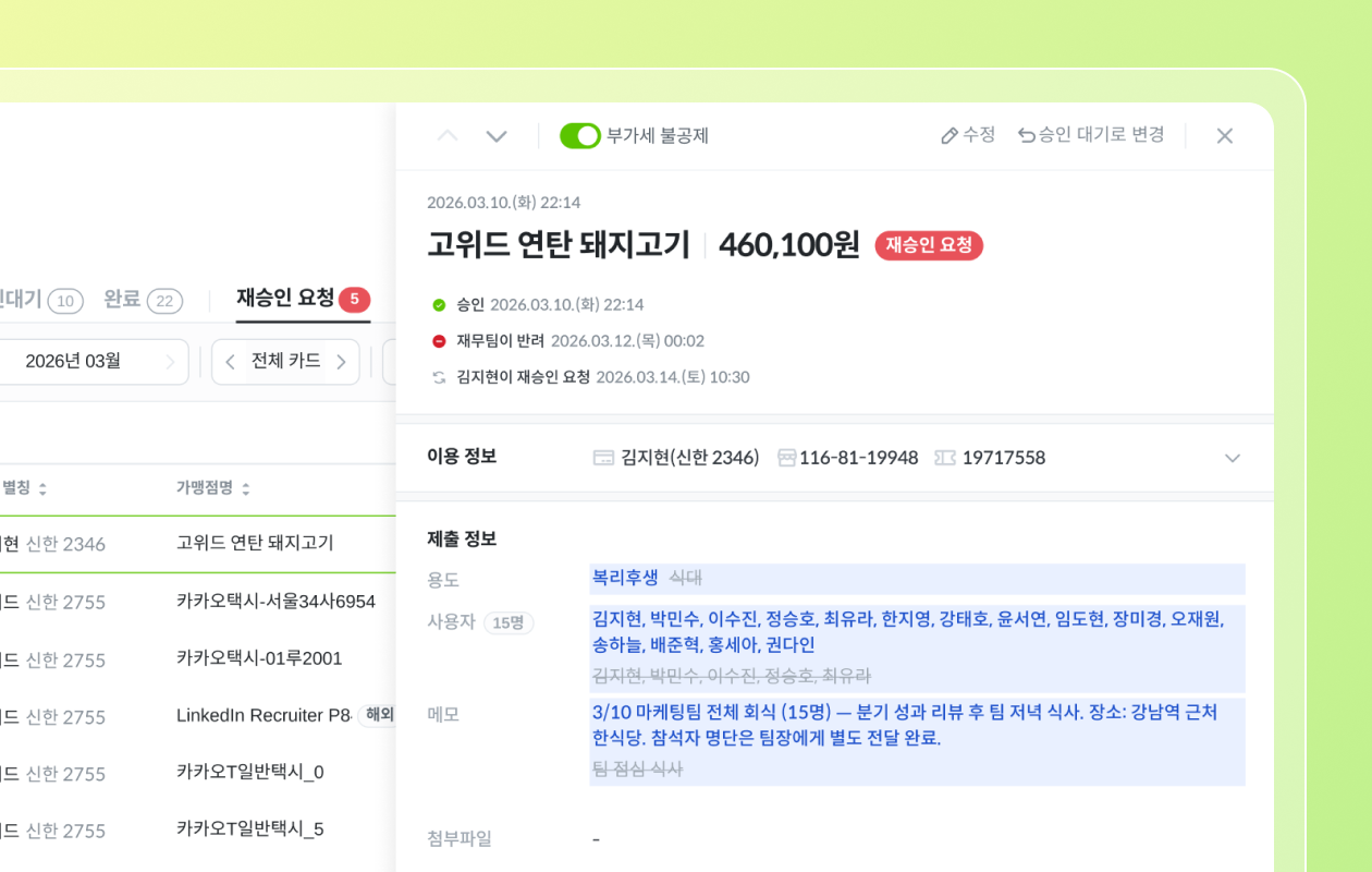 용도별 가이드 문구를 통해 임직원이 영수증 제출 과정에서 세부 규정을 즉시 확인하고 혼선 없이 제출할 수 있어요