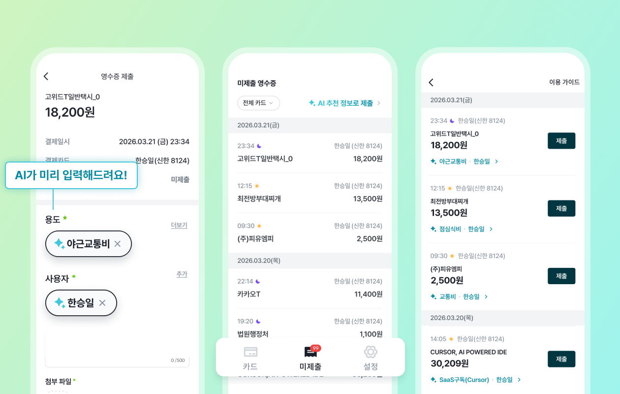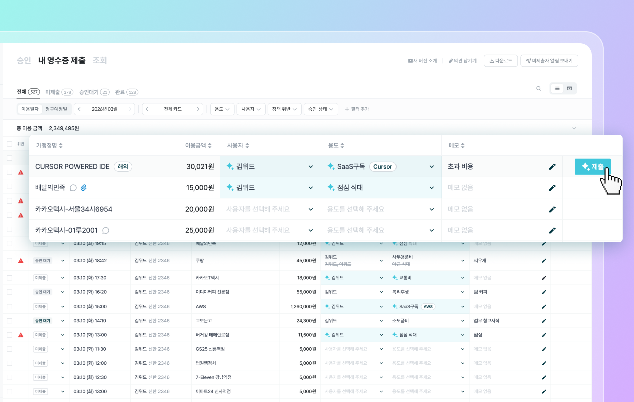 AI 추천으로 영수증을 더 빠르게 제출할 수 있는 기능이 오픈되었습니다!