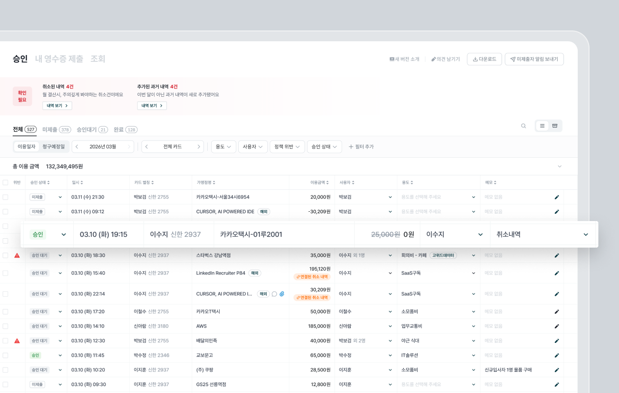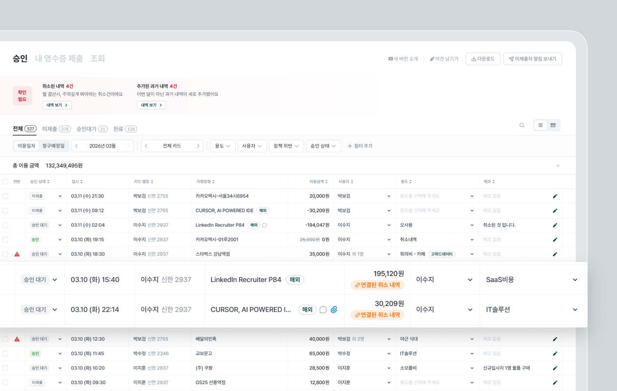 📢 취소내역 처리 방식이 변경되고, 늦게 등록되는 이용 내역도 놓치지 않도록 개선되었습니다.