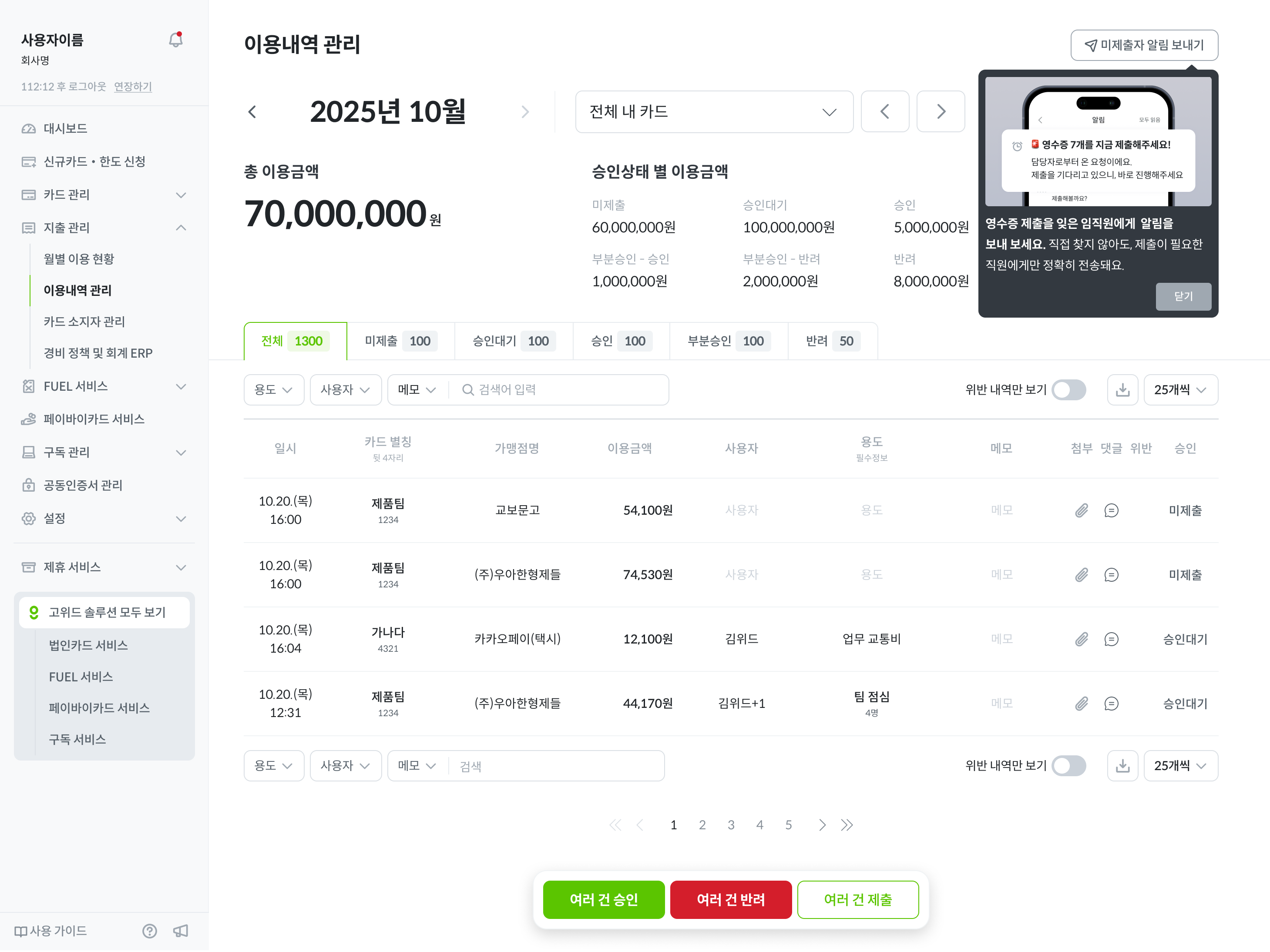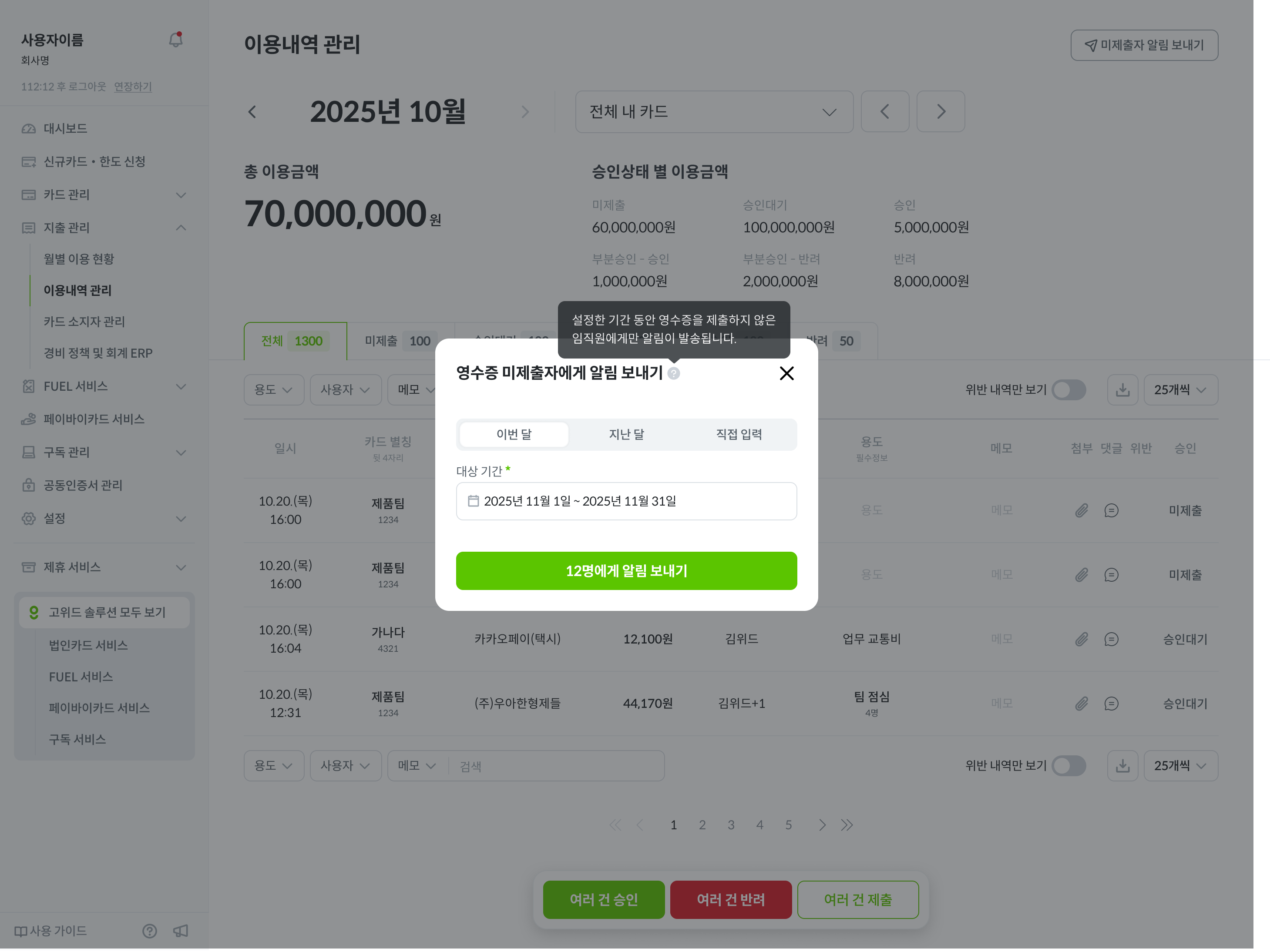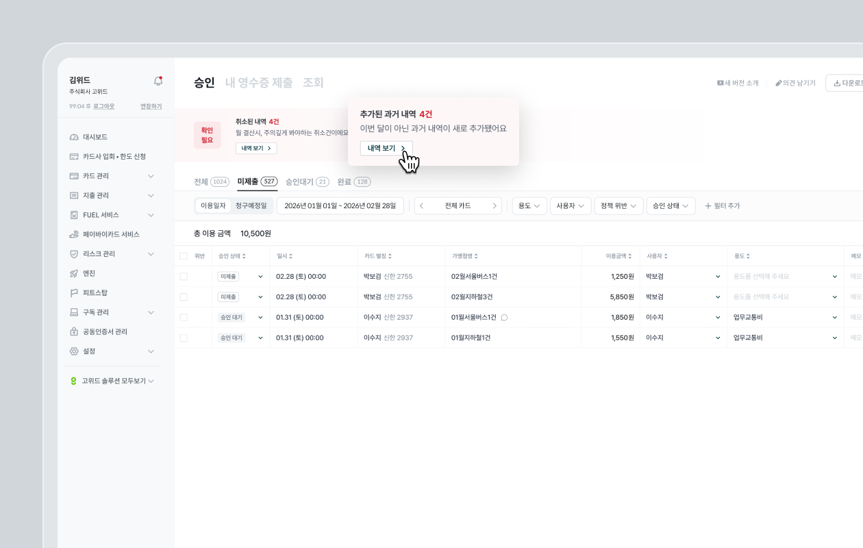 영수증을 제출하지 않은 임직원에게 알림을 보낼 수 있는 [미제출자 알림 보내기] 기능이 업데이트 되었어요.