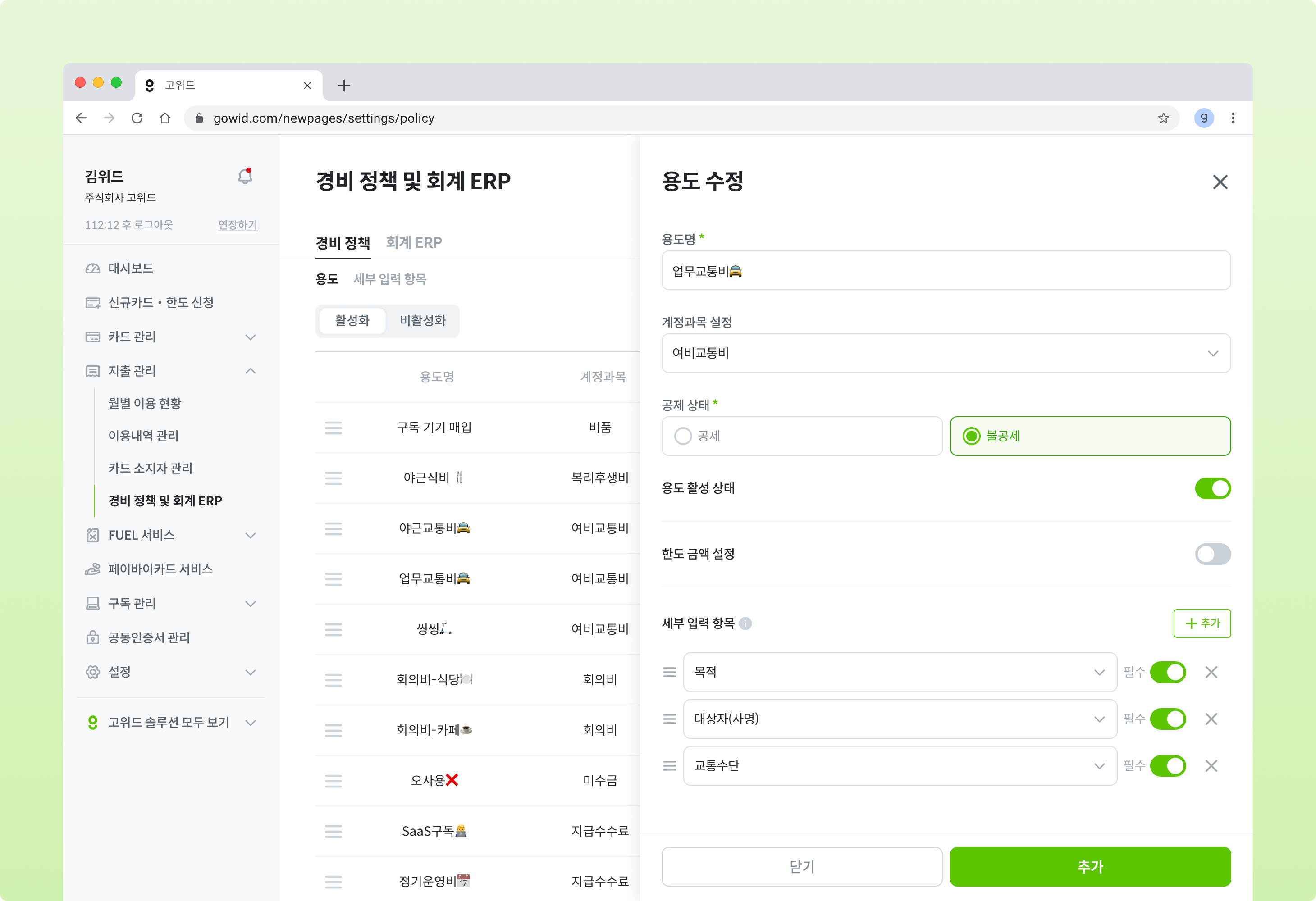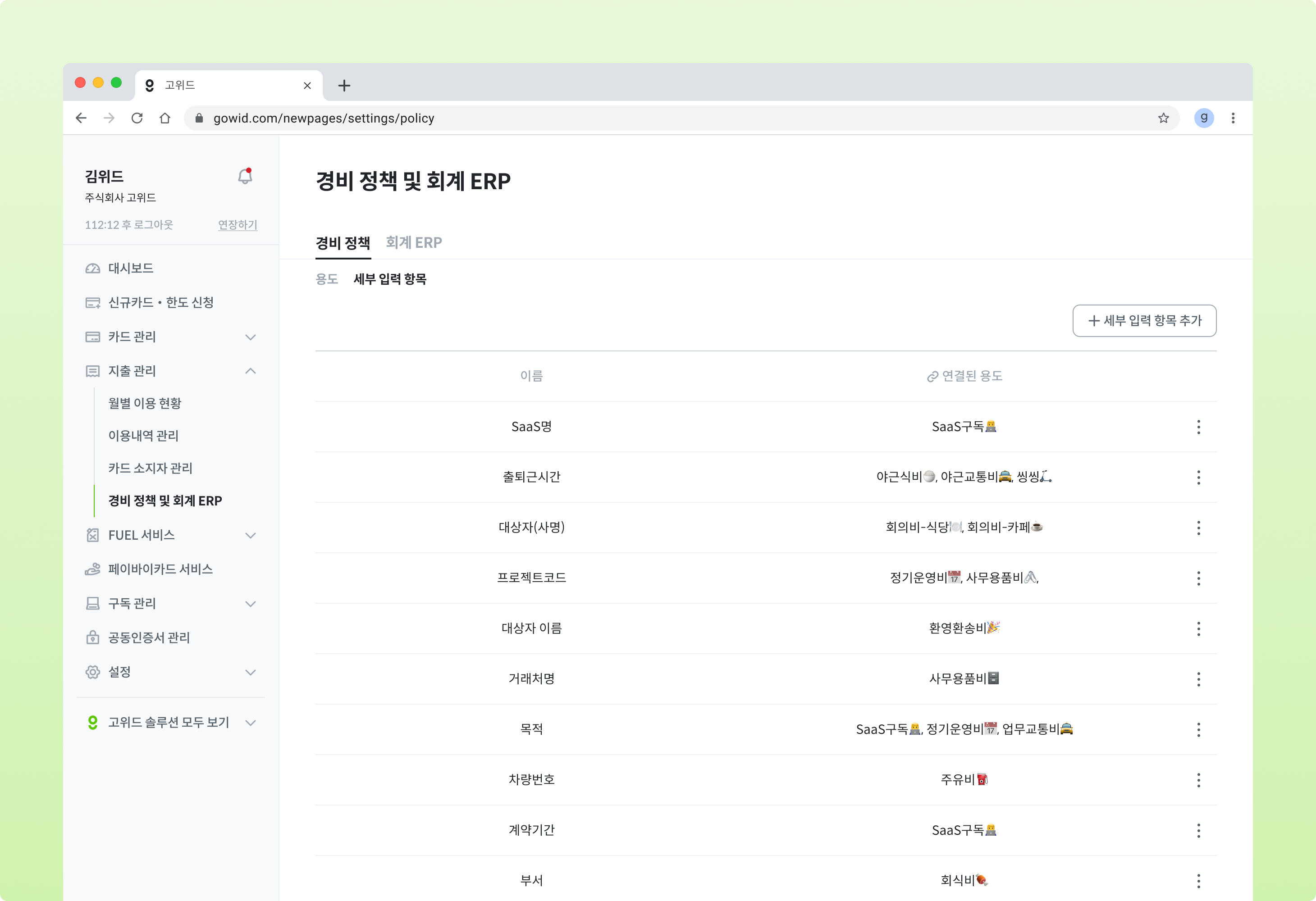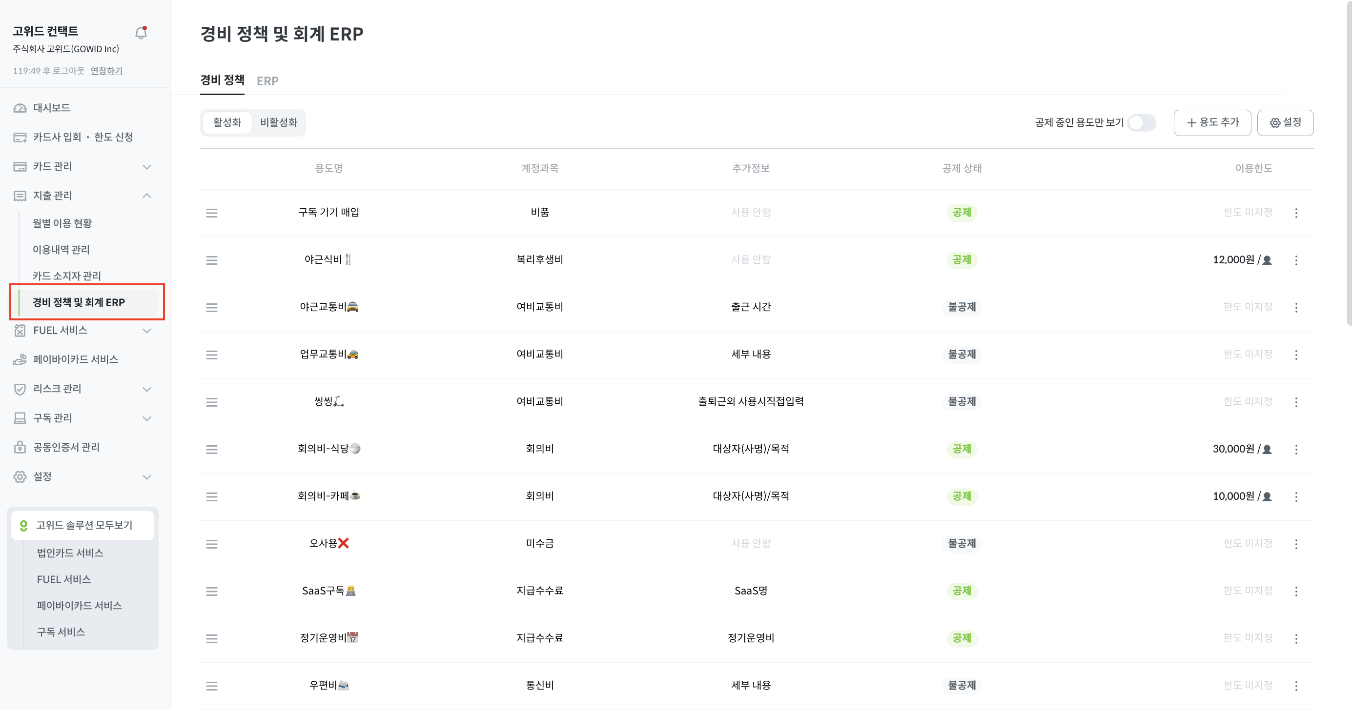 경비 정책과 회계 ERP 메뉴가 하나로 통합되었습니다.