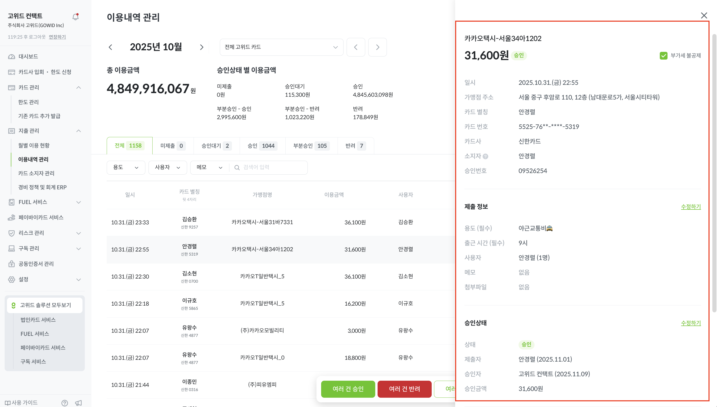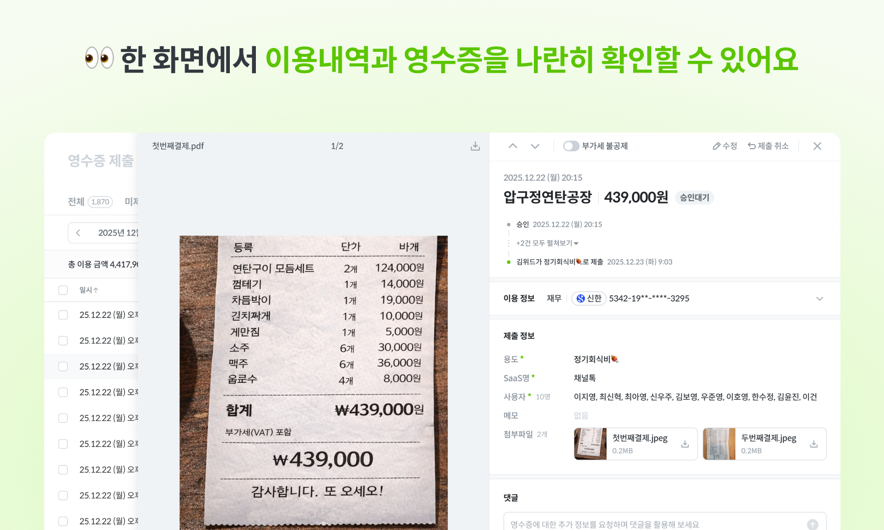 이용내역 상세 조회 시 주요 항목을 바로 확인할 수 있도록 사업자등록번호/승인번호 노출 위치를 변경하고, 쉽게 복사할 수 있도록 기능을 개선했어요
