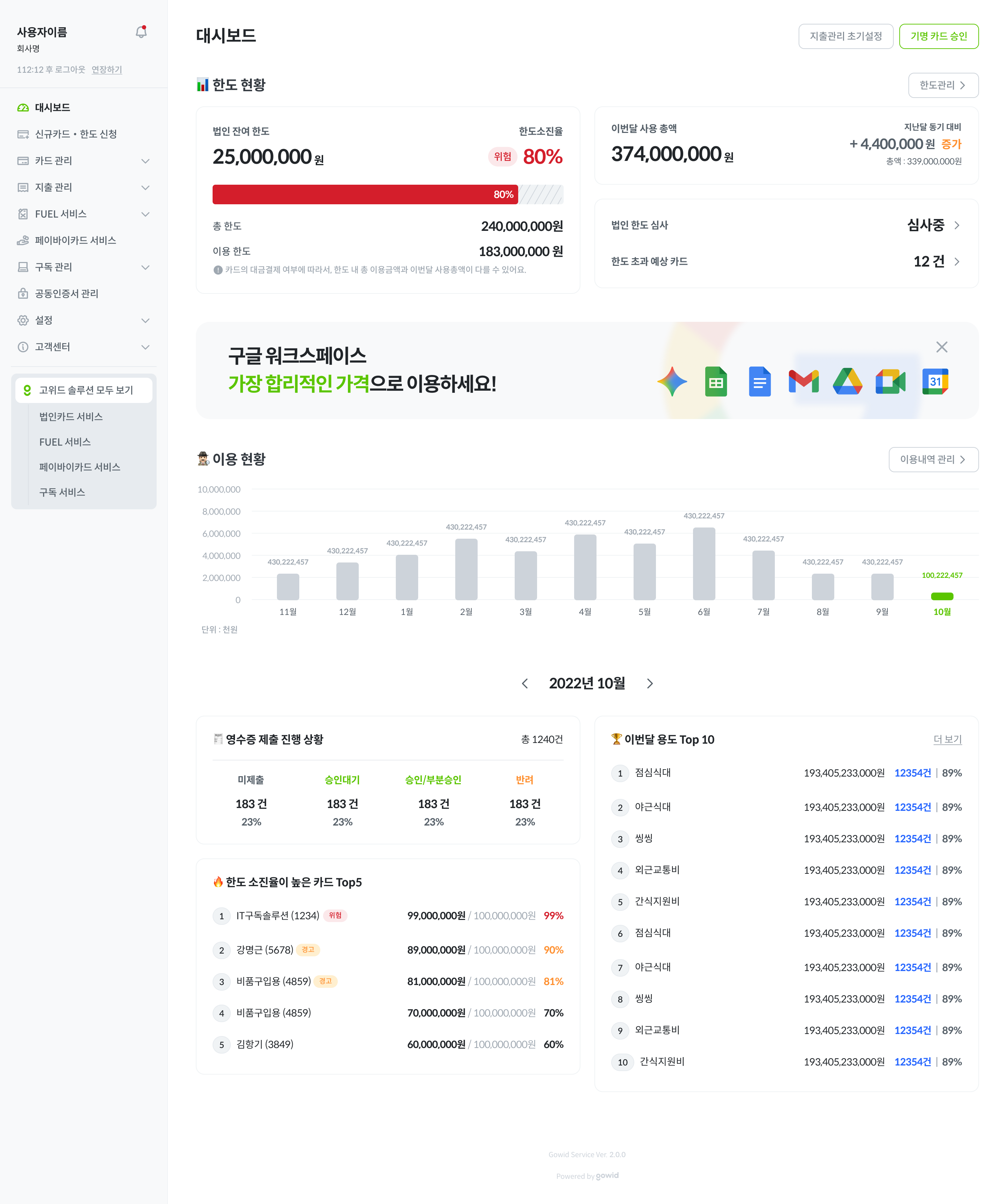 이번 달 법인카드로 사용한 총액을 지난 달과 비교해서 확인할 수 있어요.