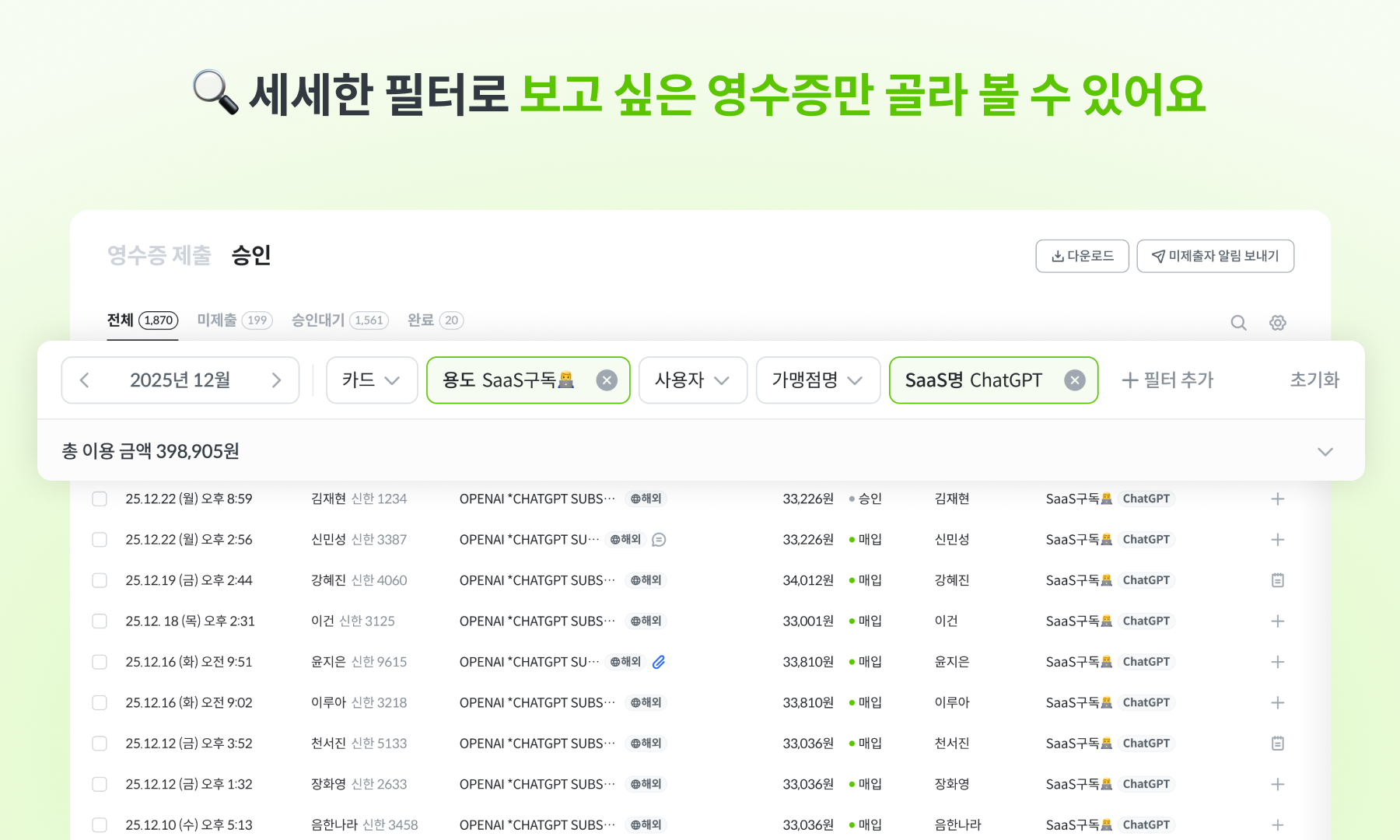 세부 필터로 필요한 내역만 골라서 조회할 수 있어요.