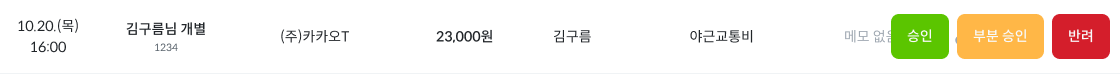 좌측에 체크박스를 통해 승인/반려 처리가 필요한 내역을 다수 선택한 후, [n건 승인] or [n건 반려] 버튼을 클릭하면 승인/반려 처리가 완료됩니다.