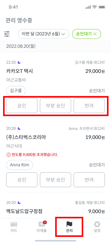 앱 하단의 [관리] 메뉴에서 승인대기 중인 영수증을 모두 조회할 수 있습니다. 해당 화면에서는 영수증의 결제정보, 필수입력 정보, 정책 한도 초과 여부 등을 확인 후 승인 처리할 수 있습니다.