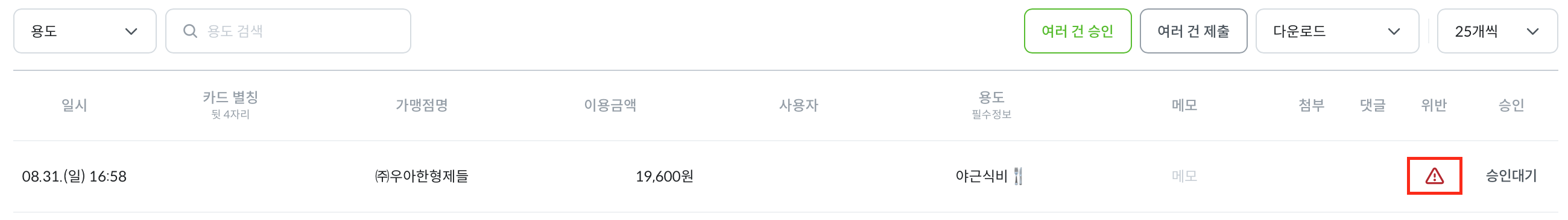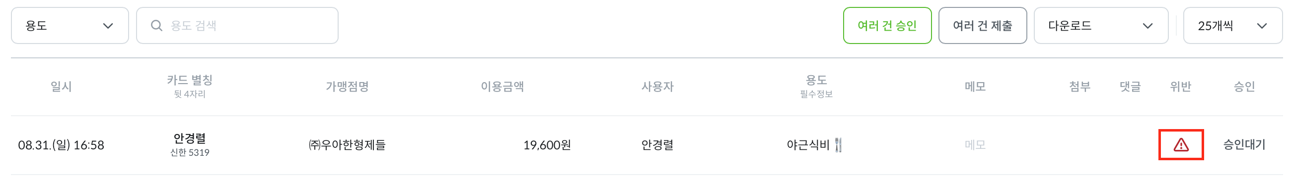 [이용내역 관리] 메뉴 내 리스트에서 승인대기 중인 이용내역에 마우스를 올리면 해당 내역을 [승인], [부분승인], [반려] 버튼이 나타납니다. 해당 리스트에서 ‘위반’ 영역에 별도 표시가 없는 경우 정해진 정책 및 한도 내에서 알맞게 사용된 내역입니다.