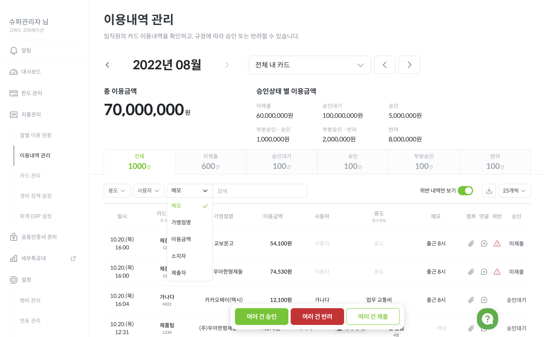 많은 결제 내역을 한번에 승인/반려해야 하는 경우 [이용내역 관리] 메뉴에서 하단의 [여러 건 승인] or [여러 건 반려] 버튼을 클릭하세요.