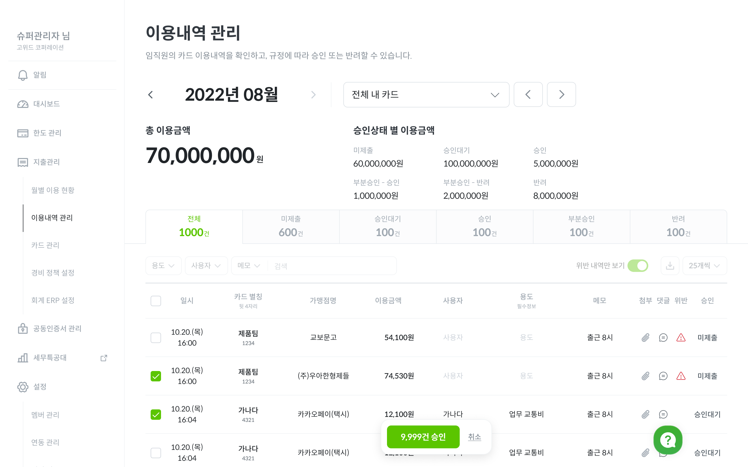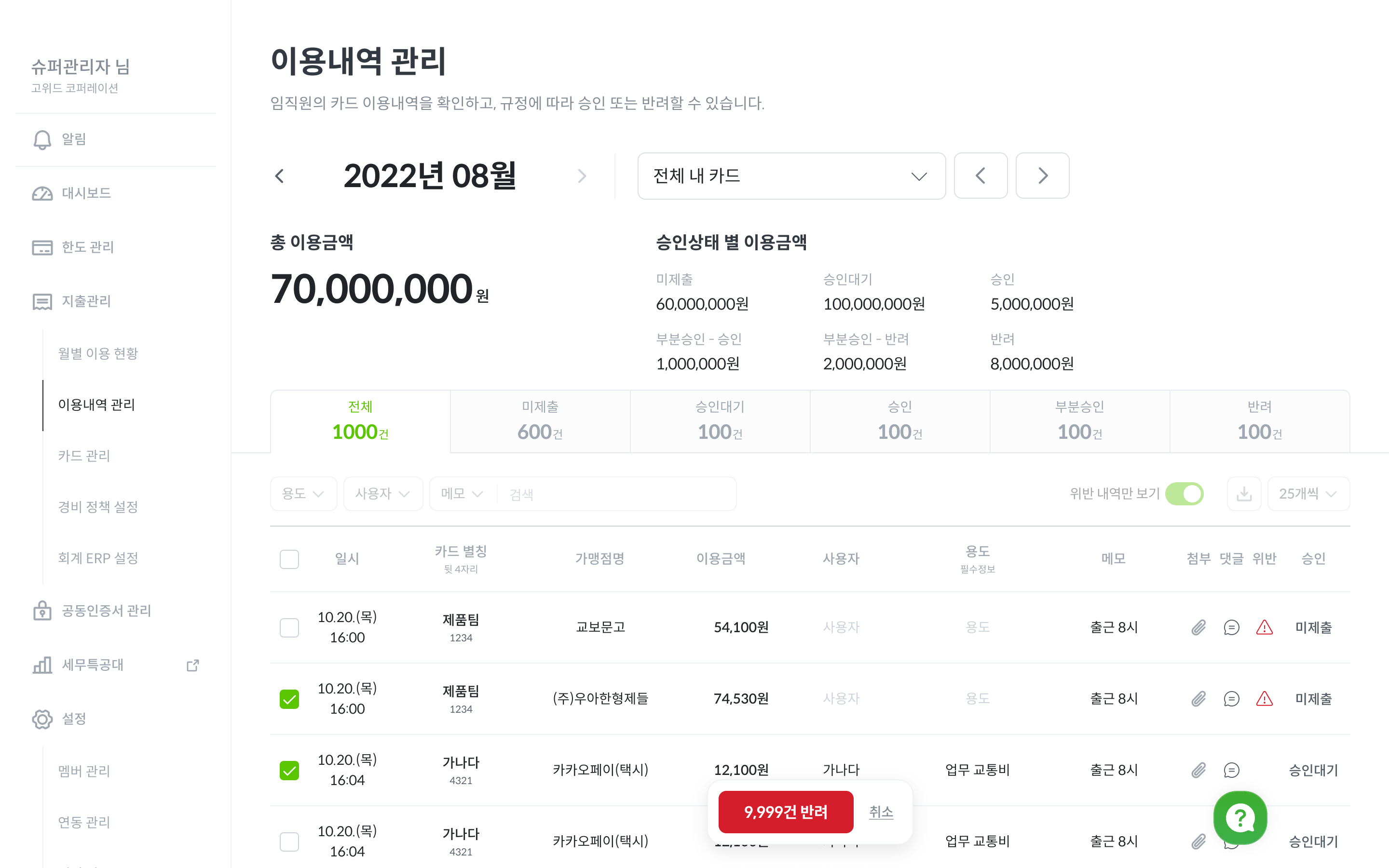 슈퍼 관리자 및 카드 총괄 관리자 : 모든 고위드 법인카드