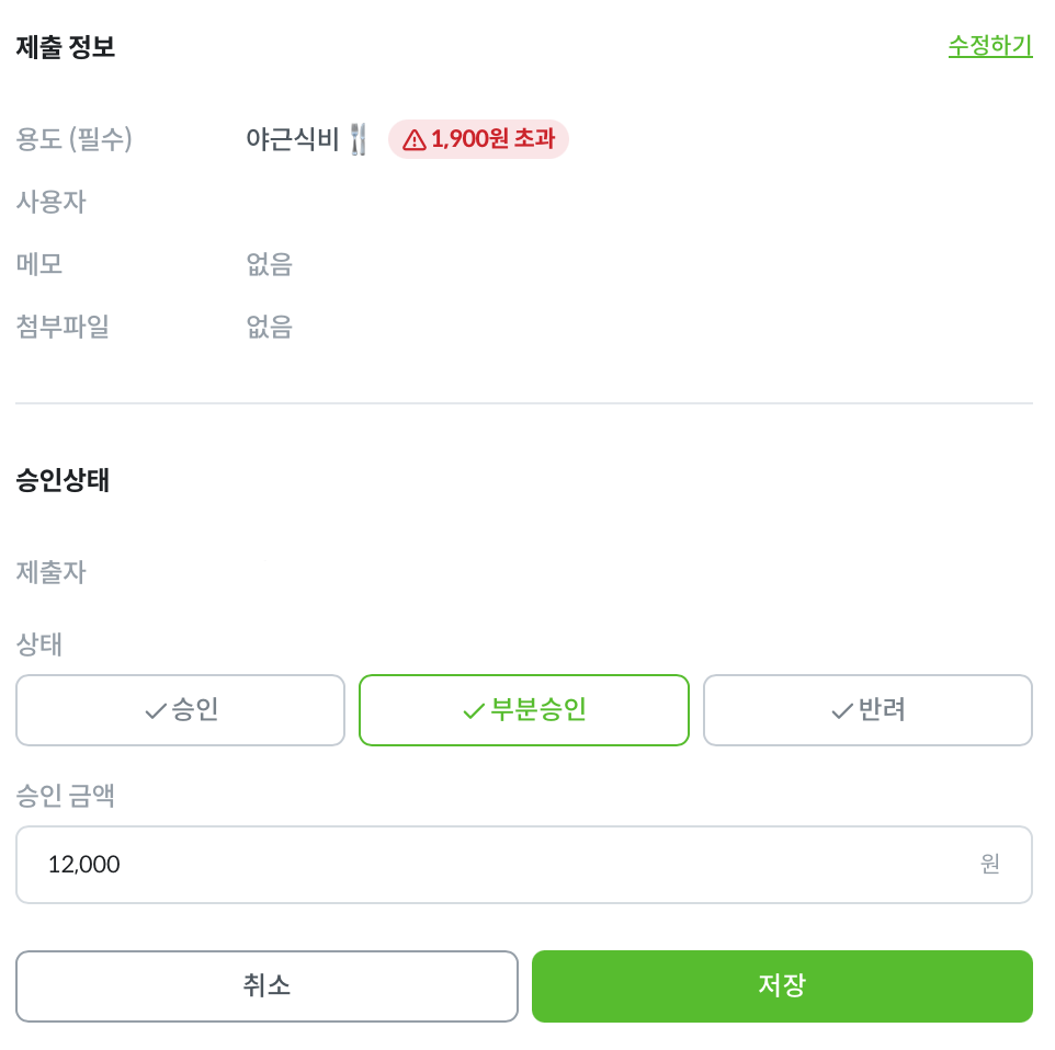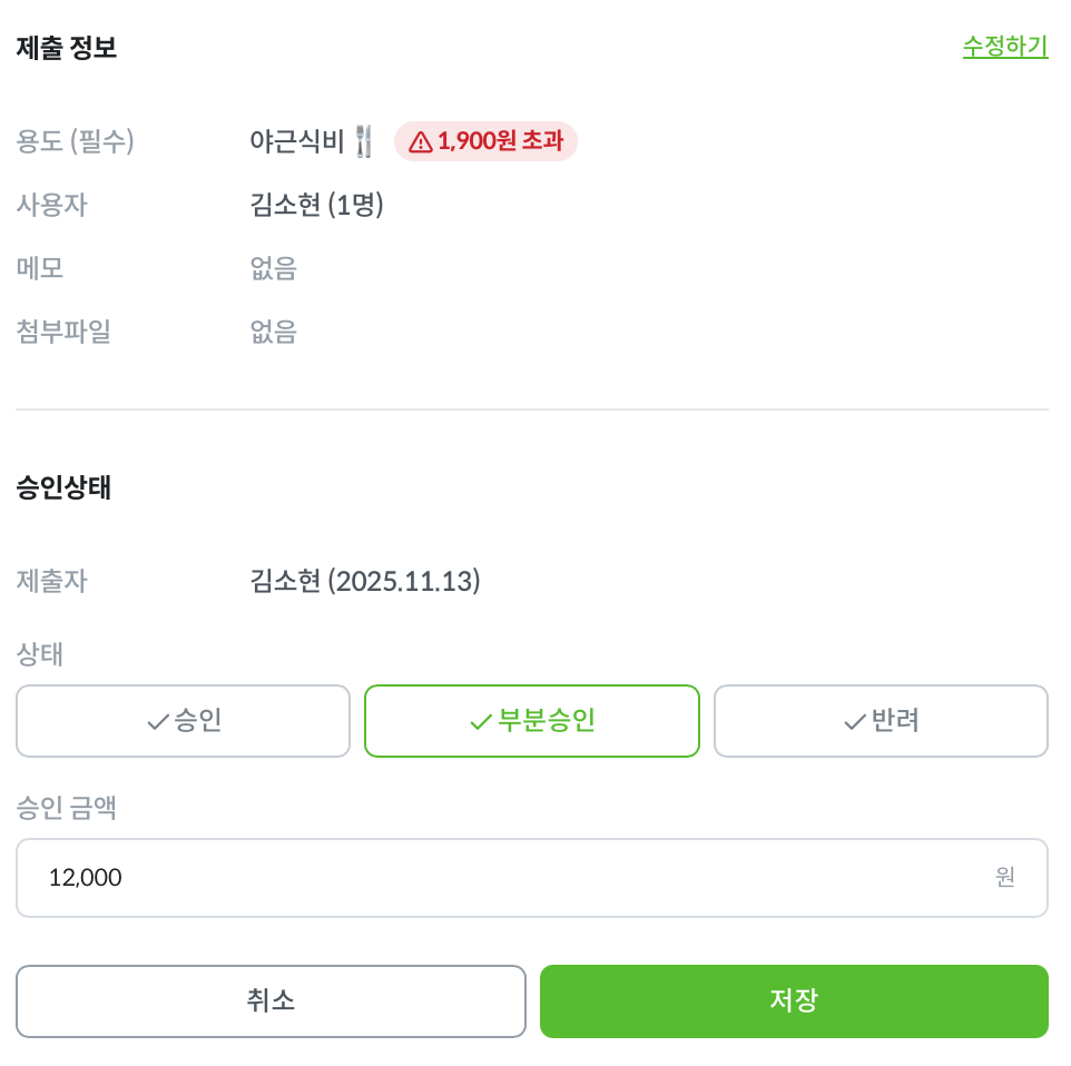 일부 금액만 정책을 초과한 경우 ‘부분승인’을 선택할 수 있습니다. 부분승인 금액은 설정된 정책에 따라 자동으로 입력됩니다.