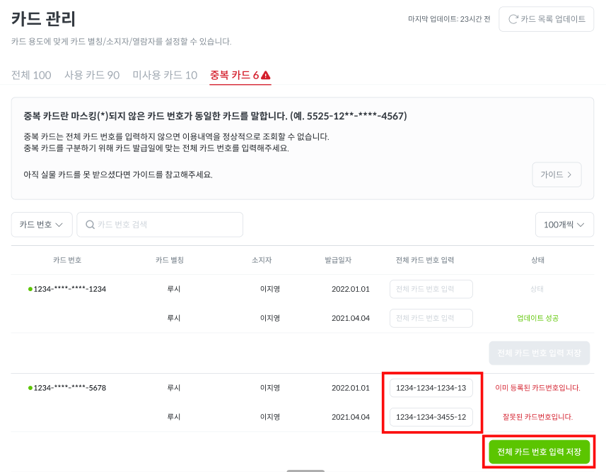 카드 뒷자리 번호 4개가 동일하더라도, 카드별로 발급일자는 다릅니다. 발급일자를 기준으로 구분하여 해당 카드의 전체 카드 번호를 입력해주세요. 입력 완료 후 [전체 카드 번호 입력 저장] 버튼을 눌러주세요. 이후 약 10분 내로 카드별 이용내역이 정상적으로 매칭되어 보여집니다.
