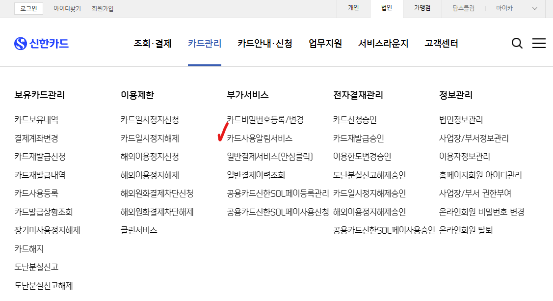 신한카드 법인 홈페이지 → 부가서비스 → 카드 사용 알림 서비스