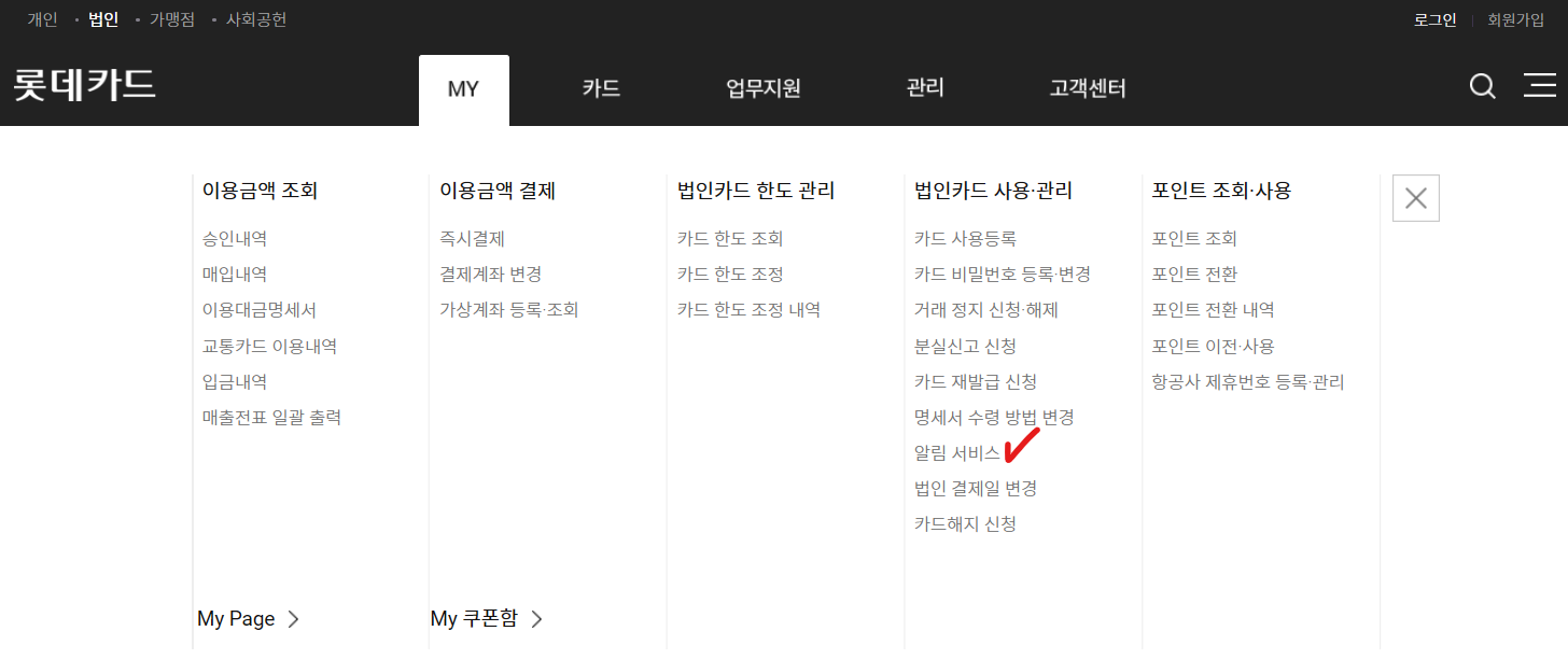 롯데카드 법인 홈페이지 → MY → 법인카드 사용 관리 → 알림 서비스