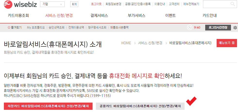 BC카드 법인 홈페이지 → 서비스 신청/변경 → 바로 알림 서비스(휴대폰 메시지) → 지정, 공용카드 구분하여 신청