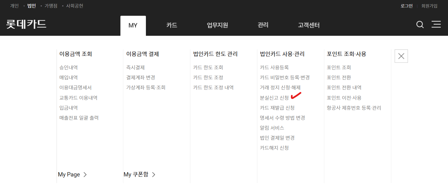 법인 홈페이지 로그인 → MY → 법인카드 사용 관리 → 분실신고 신청