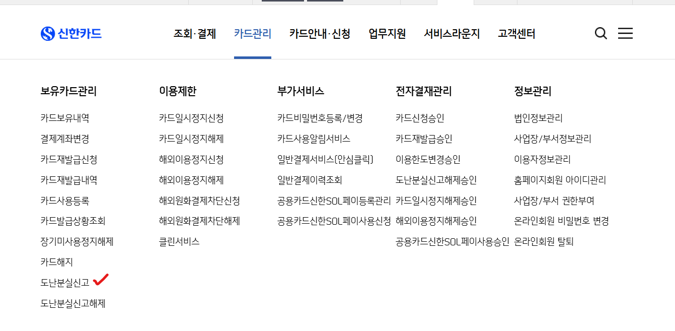 법인 홈페이지 로그인 → 카드 관리 → 보유카드관리 → 도난분실신고