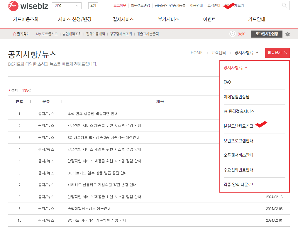 BC카드 wisebiz 홈페이지 로그인 → 고객센터 → 우측 메뉴보기 → 분실도난카드신고