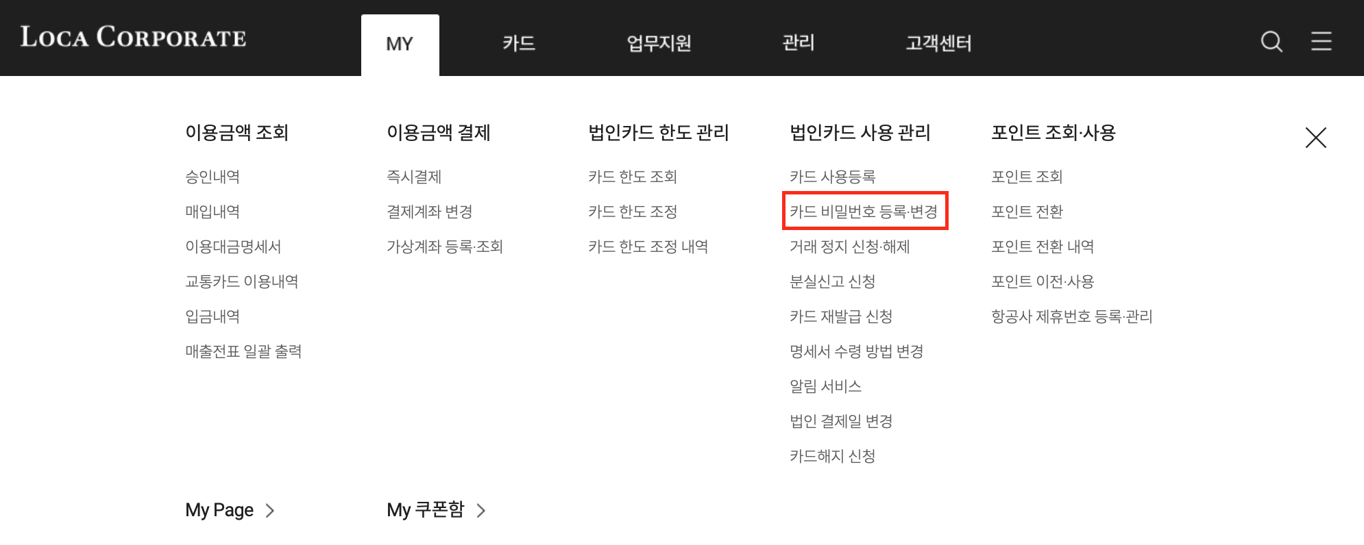 MY > 법인카드 사용 관리 > 카드 비밀번호 등록·변경 클릭