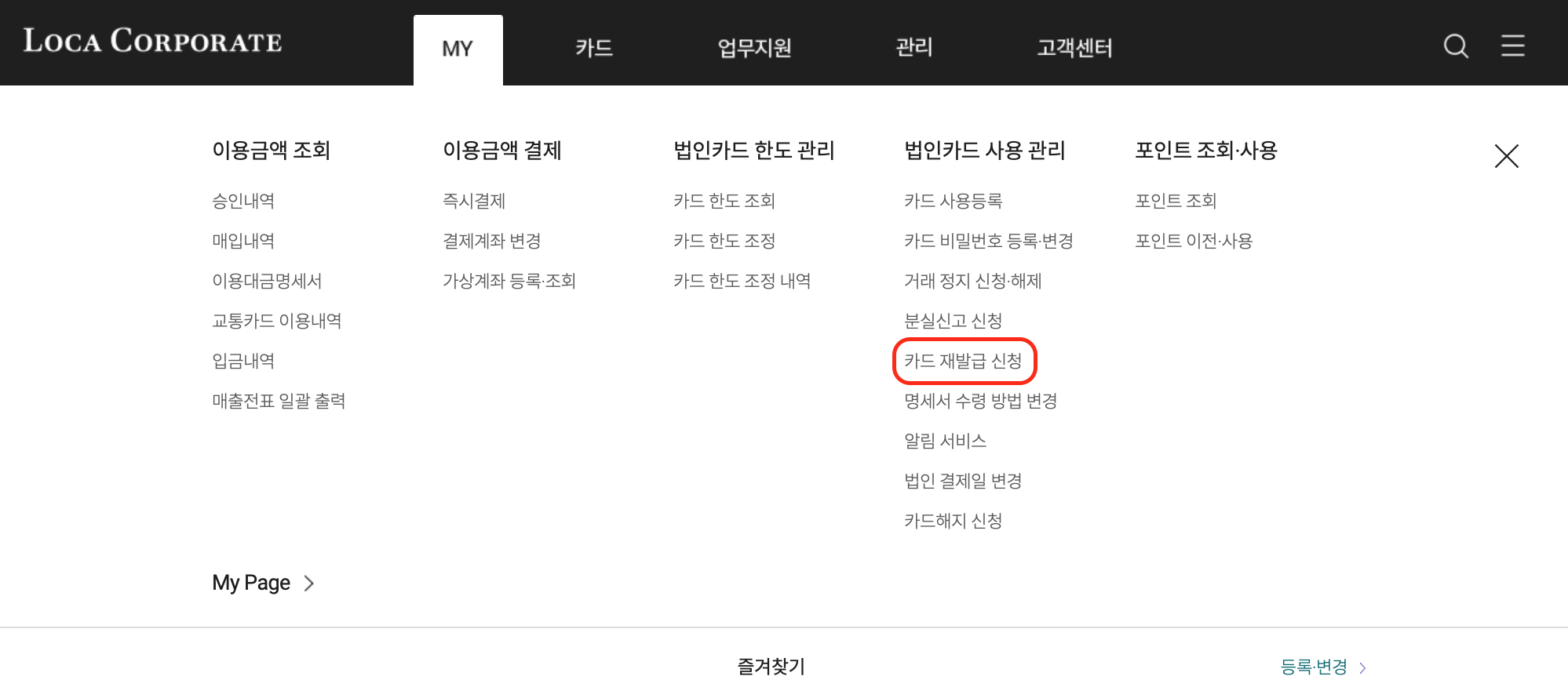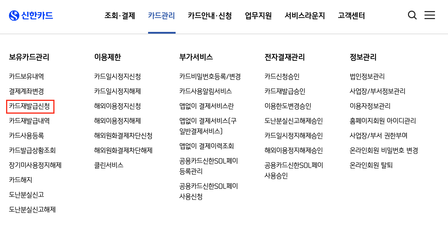 카드재발급신청을 클릭해주세요.