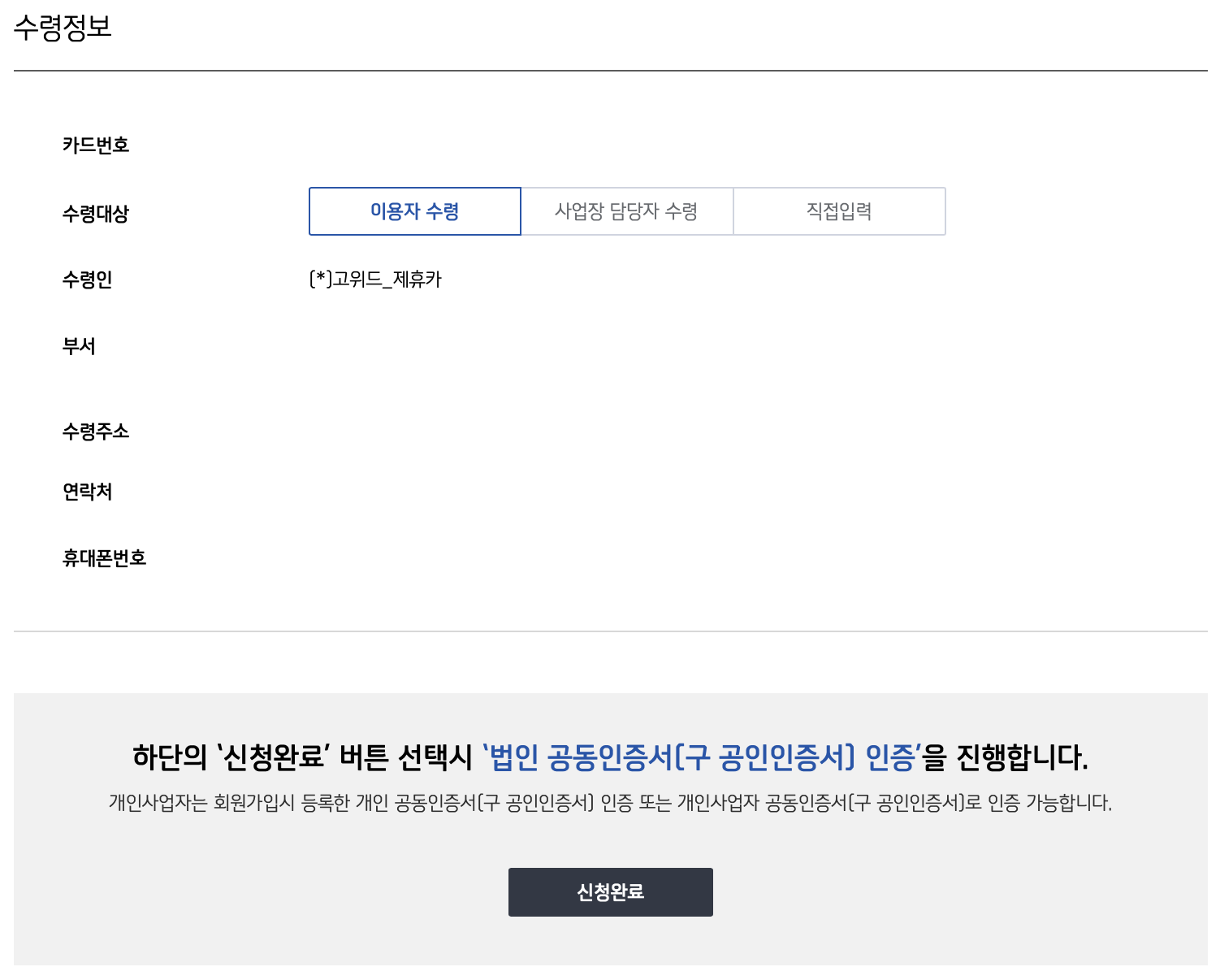 상기 주소는 수령지 정보만 활용됩니다. 만일 기타 주소로 카드수령을 원하시는 경우 ‘직접입력’ 상태에서 등록하시면 됩니다.