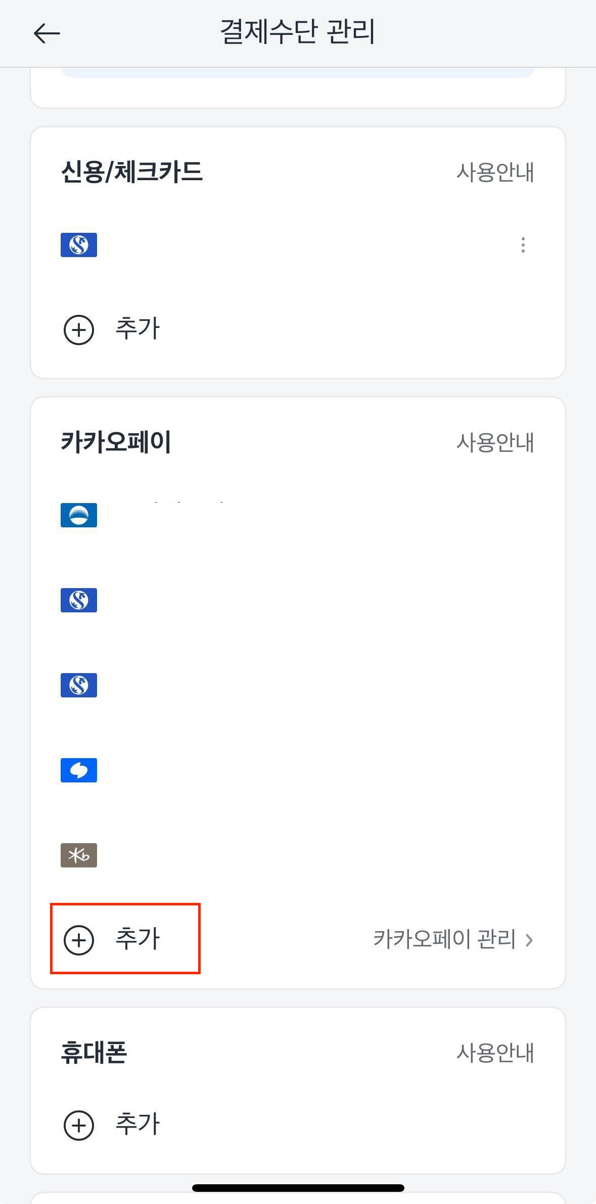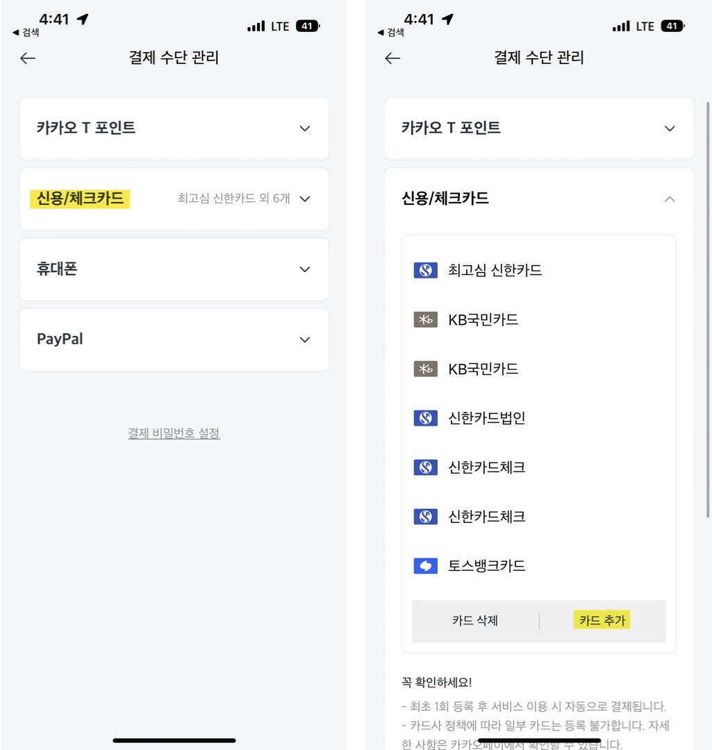 카카오 T(App.)에서 등록시, 신용/체크카드가 아닌 카카오페이 하단에 추가 버튼을 통해서만 카드 등록이 가능합니다.