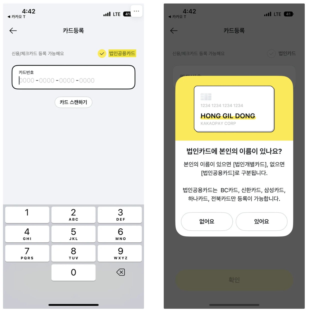 무기명 카드를 등록할 때는 법인등록번호가 필요합니다