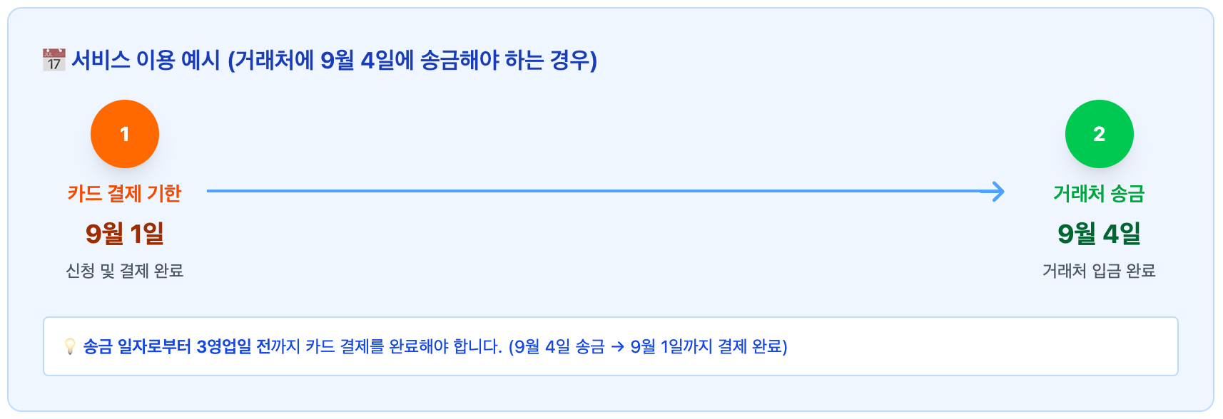 서비스 신청 후 카드 결제일로부터 3영업일 후 거래처에 송금이 이뤄집니다.