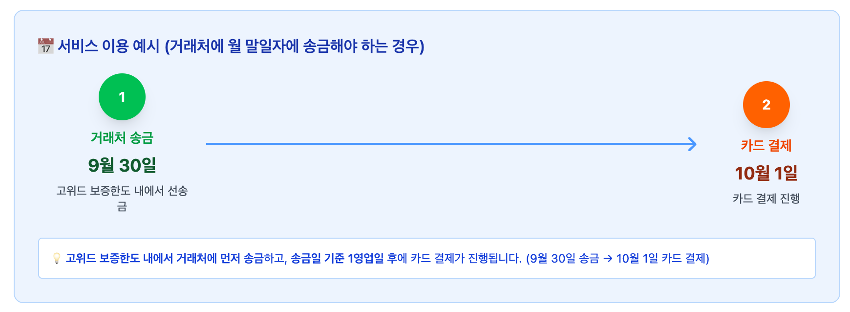 (3) 만약, 월 말일 자로 거래처(판매처)에 지급이 필요한 경우가 있다면, 먼저 대금을 거래처에 송금한 뒤, 익월 1일에 카드 결제를 진행할 수 있습니다.