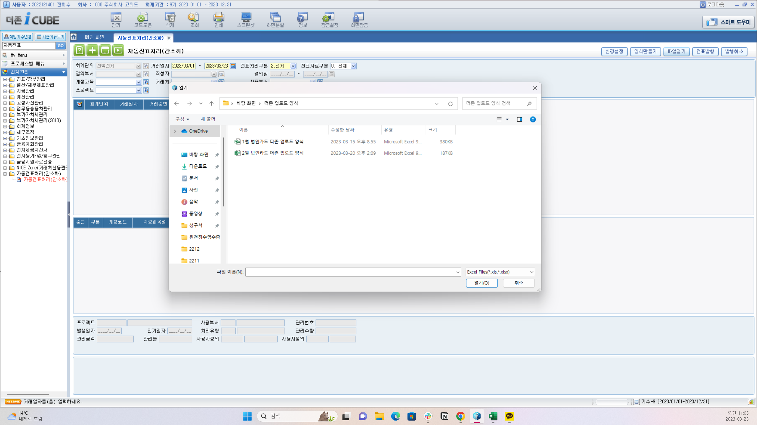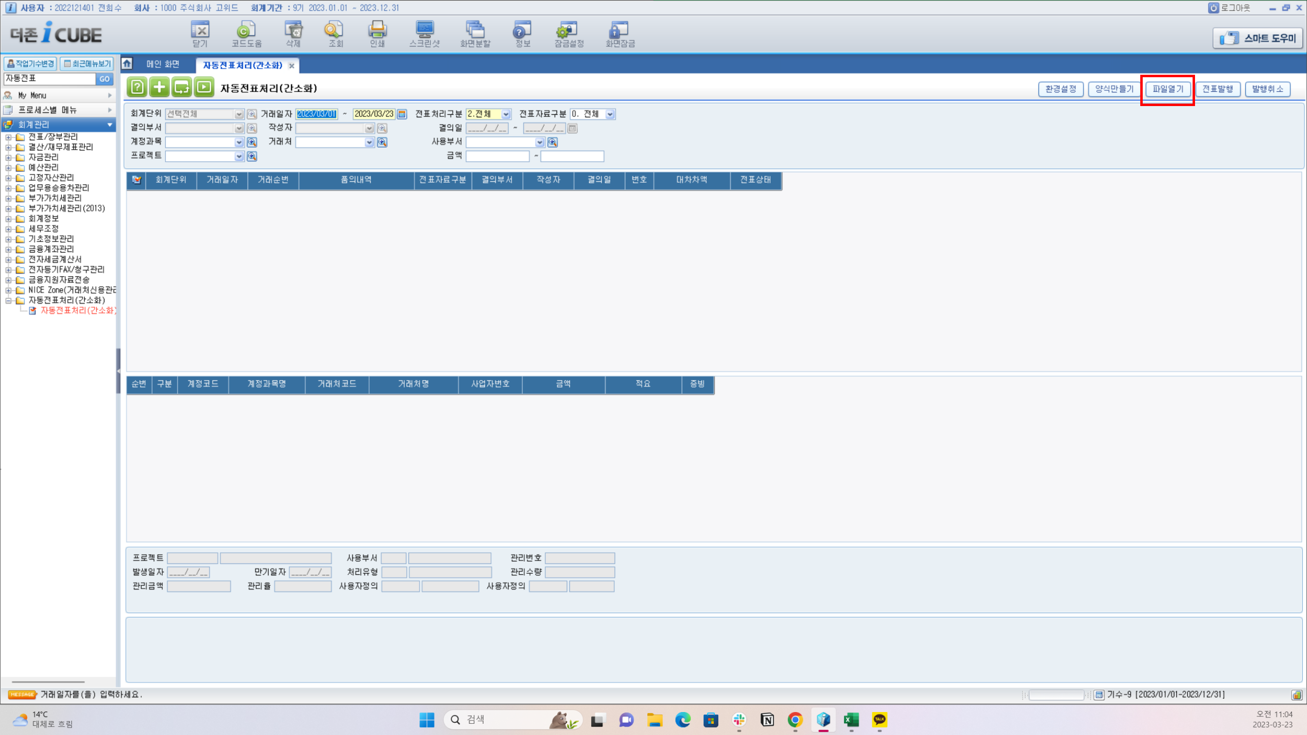 더존-iCUBE의 경우 [자동전표처리(간소화)] 메뉴에서 우측 상단의 [파일열기] 버튼을 클릭하신 후, 고위드에서 다운로드 받은 파일을 그대로 업로드해주시면 됩니다.