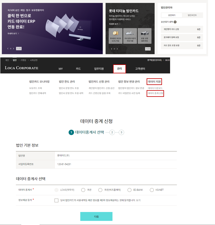 corp.lottecard.co.kr → 관리자 로그인 → 관리 → 데이터지원 → 데이터중계신청