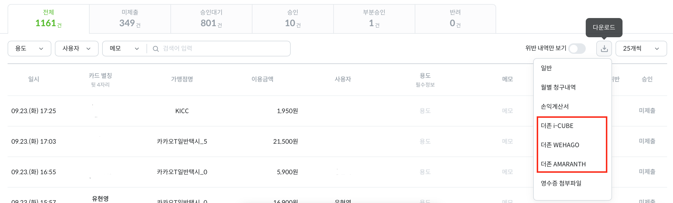 [이용 내역 관리] 메뉴에서 [다운로드] 버튼을 통해, 더존 i-CUBE 양식 또는 더존 WEHAGO, 더존 AMARANTH 양식 중 하나을 선택하여 월별로 다운로드 받을 수 있습니다.